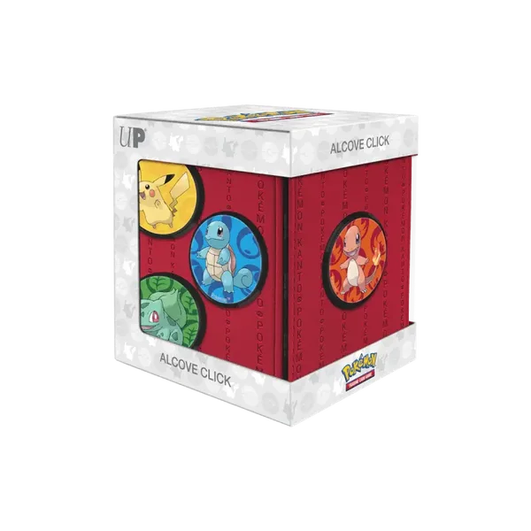 Die Alcove Click Box enthält vier thematische Buttons mit Bisasam, Schiggy, Glumanda & Pikachu. Diese Deckbox bietet Platz für bis zu 100 Sammelkarten in Standardgröße, doppelt verpackt in Ultra PRO Deck Protector® Hüllen, verfügt über einen starken Magnetverschluss und zwei Daumenaussparungen für den einfachen Zugriff auf dein Deck.